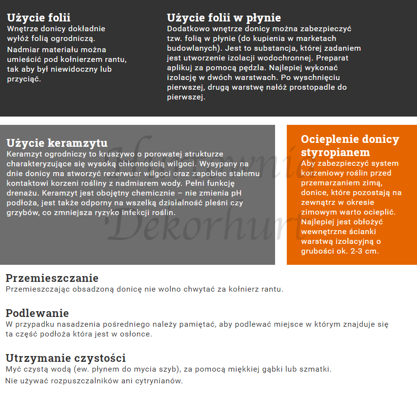 Jest to donica ogrodowa - odpowiedni surowiec i wysoka jakość wykonania sprawia, że jest odporna na różne czynniki mechaniczne i atmosferyczne - w tym jest w 100 % mrozoodporna i wytrzymuje nawet najsurowsze zimy. Włókno szklane jest także całkowicie niepodatne na promienie UV oraz rdzę.