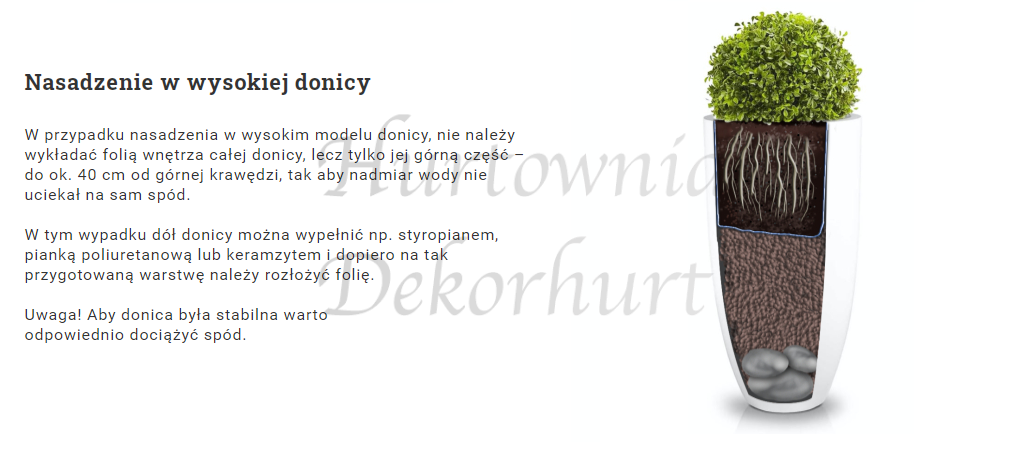 Zależnie od przeznaczenia sam możesz zdecydować, czy produkt ma posiadać odpływ wody czy też nie - na spodzie donicy przygotowaliśmy specjalne zagłębienia przeznaczone do łatwego wywiercenia dziurki.