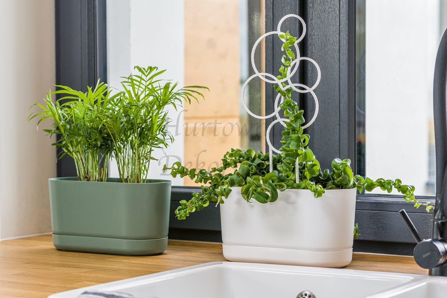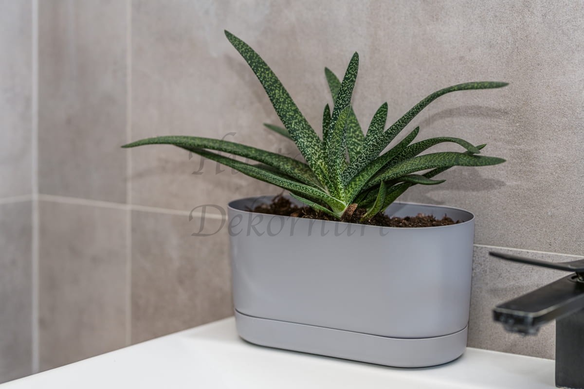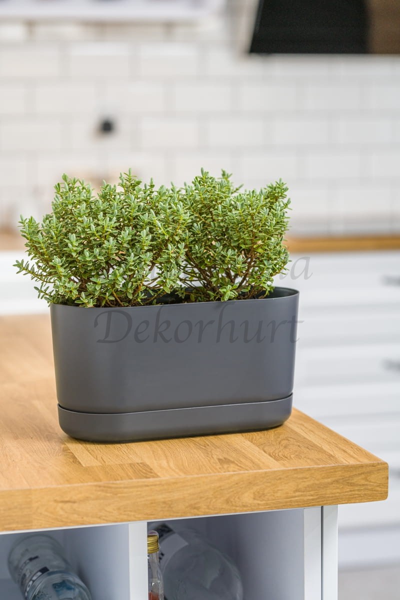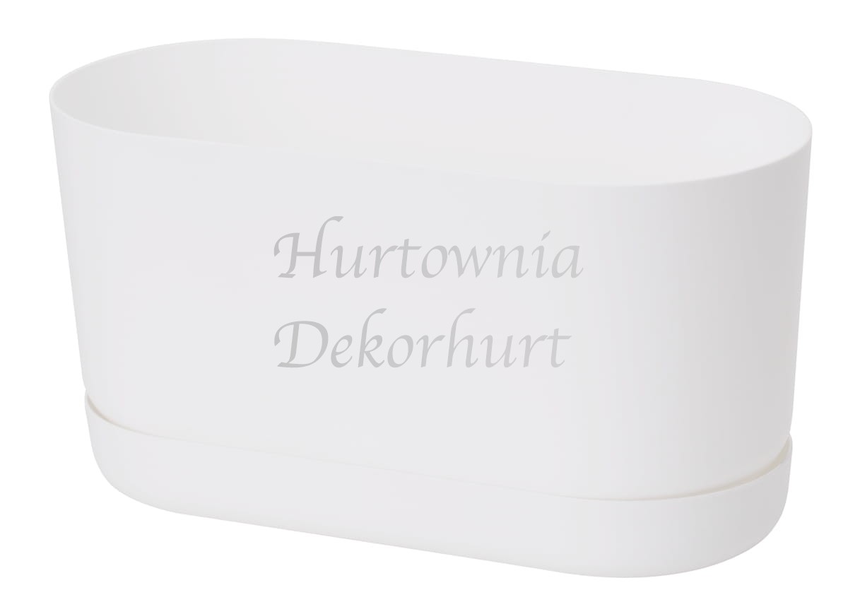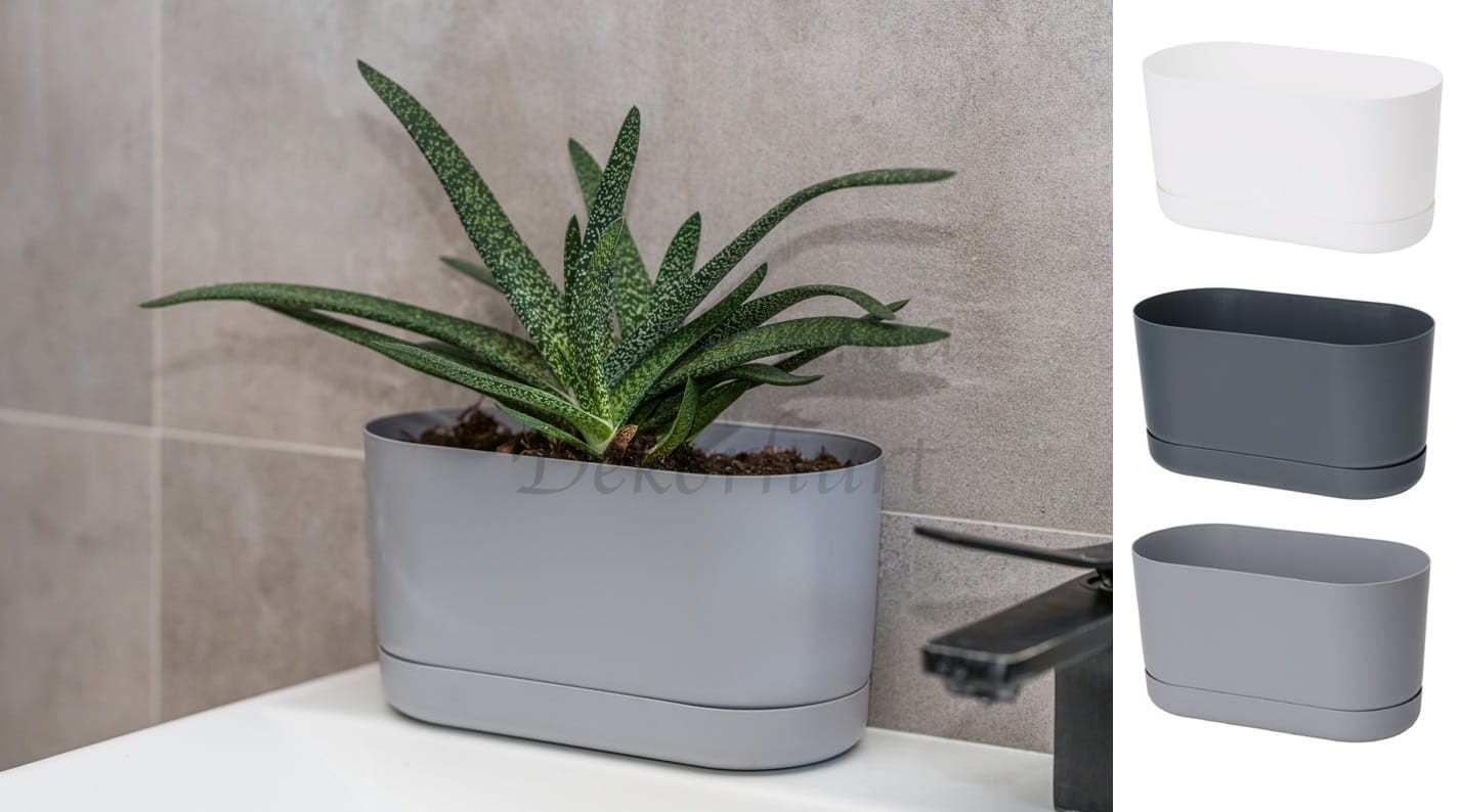 Lekka, wykonana z wytrzymałego plastiku doniczka wraz z dedykowaną podstawką.