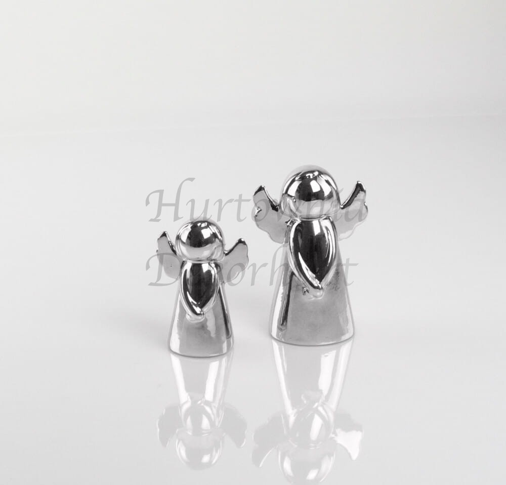 Figurka w kształcie aniołka. Artykuł wykonany jest z ceramiki cienkościennej i jest wykończony wysokiej jakości szkliwem lustrzano-srebrnym.