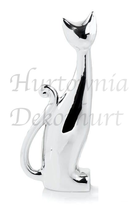 Figurka w kształcie kota. Artykuł wykonany jest z ceramiki cienkościennej i jest wykończony wysokiej jakości szkliwem lustrzano-srebrnym.
