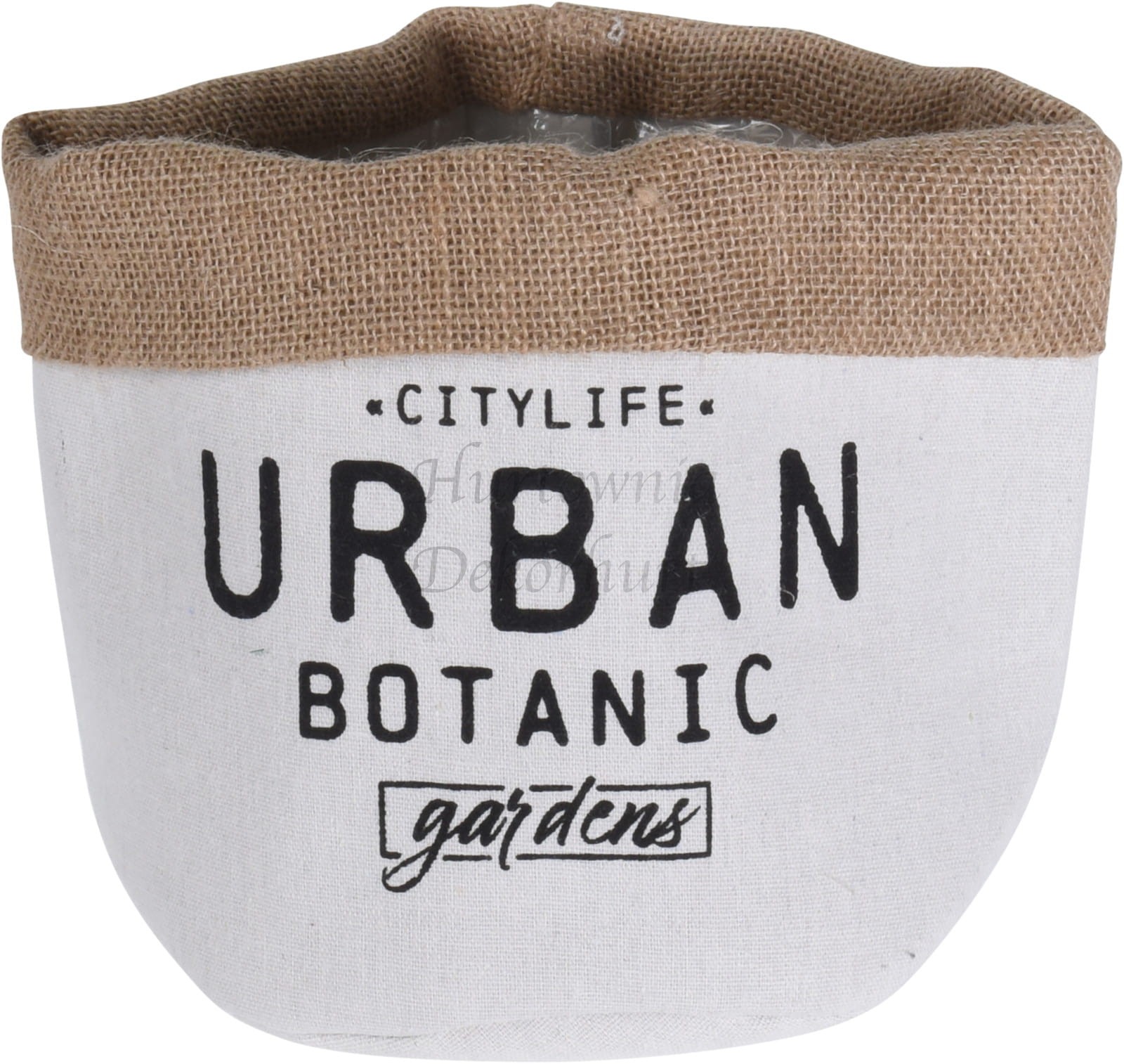 Materiałowa doniczka jutowa.