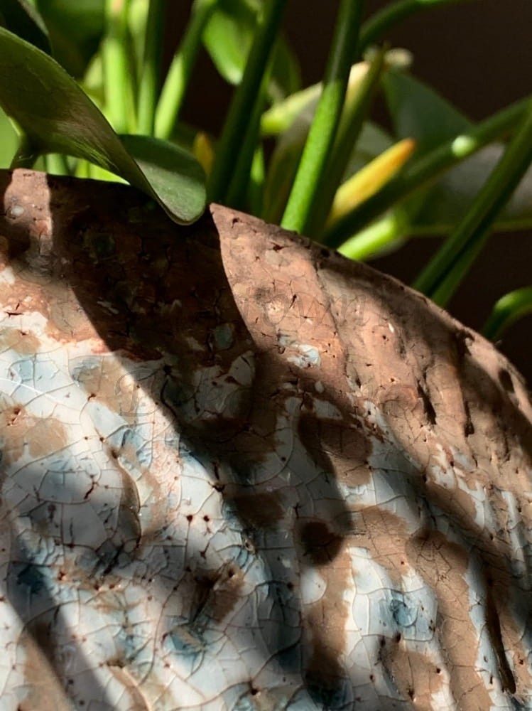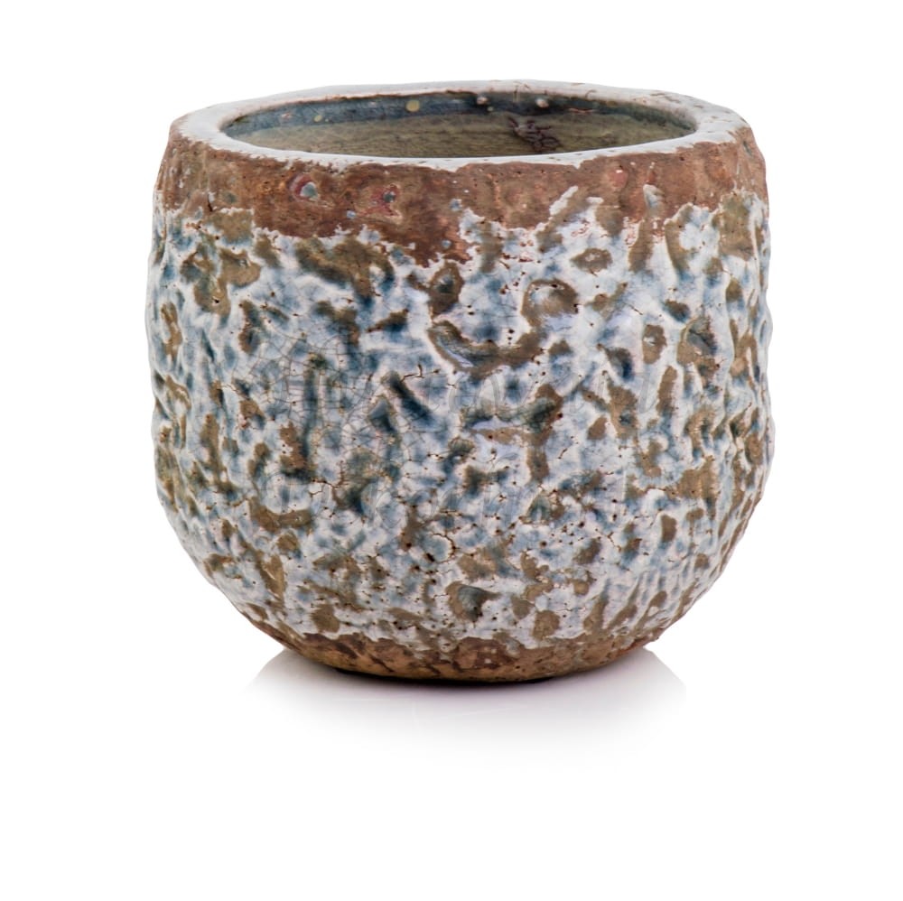 Faktura o licznych nieregularnych żłobieniach, dominuje szkliwiony błękit w zagłębieniach oraz w górnym i dolnym pasie kolor brązowy bez połysku. Liczne pęknięcia, małe dziureczki jest to celowy efekt postarzenia nadający charakteru unikatowości. Wszystko jest tu delikatne, pastelowa kolorystyka i subtelne wzornictwo.