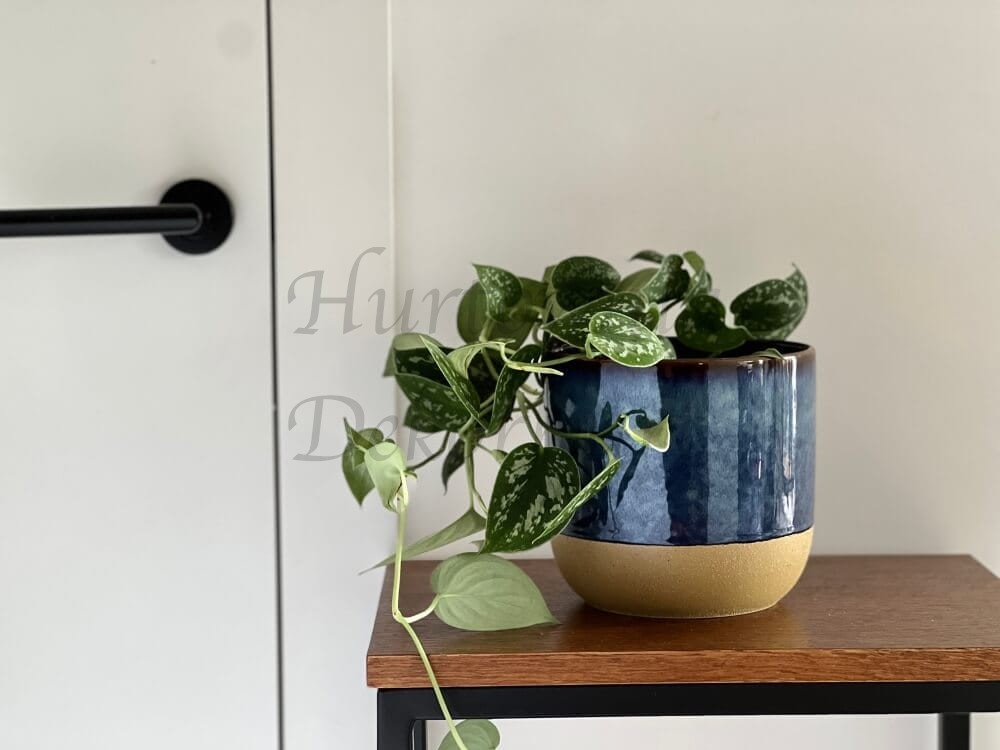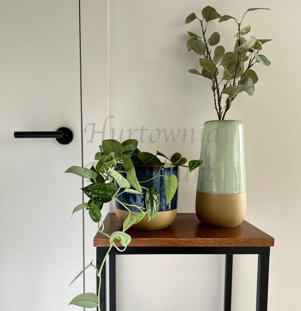 Ceramiczna osłonka doniczkowa łącząca w sobie dwie faktury – na górze szkliwo w kolorze granatowym, a na dole ceramikę wypaloną lecz nie poddaną szkliwieniu. Dwoistość faktur stanowi o atrakcyjności tej osłonki. Liczne celowe niedoskonałości (zacieki, delikatne wżery, popękane szkliwienie-crackle itp.) dodają jej oryginalnej szlachetności i jednocześnie niepowtarzalności. Doniczka ma w sobie urok artystycznego rękodzieła i pasuje do wielu stylów wnętrzarskich.