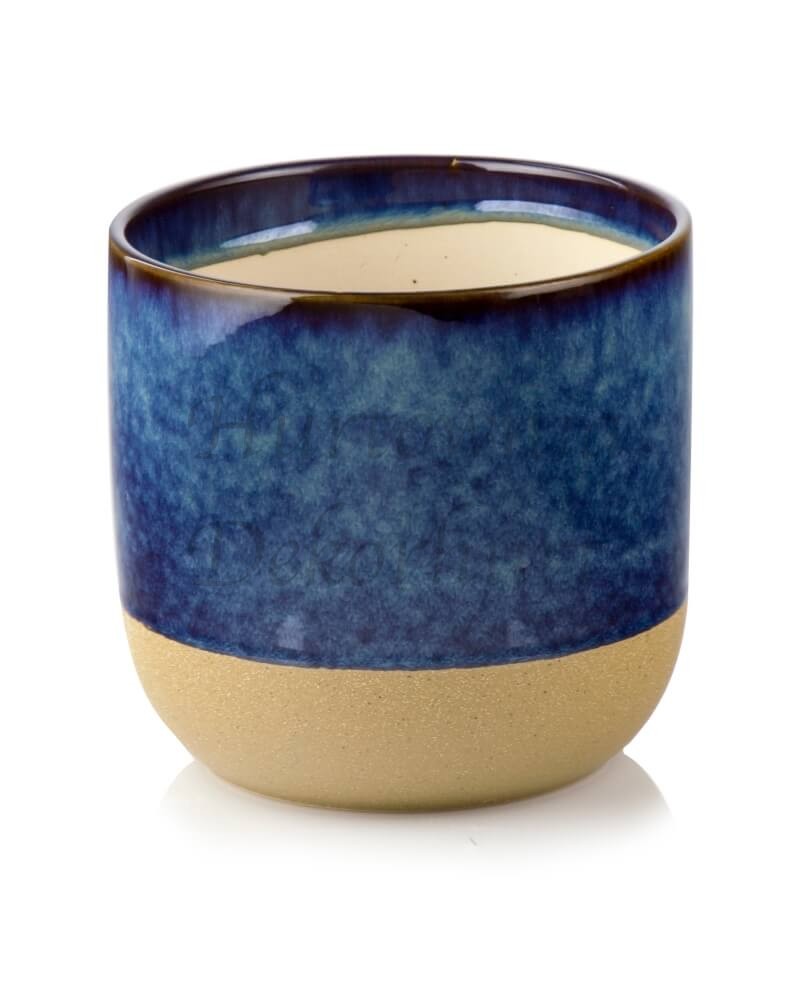 Ceramiczna osłonka doniczkowa łącząca w sobie dwie faktury – na górze szkliwo w kolorze granatowym, a na dole ceramikę wypaloną lecz nie poddaną szkliwieniu. Dwoistość faktur stanowi o atrakcyjności tej osłonki. Liczne celowe niedoskonałości (zacieki, delikatne wżery, popękane szkliwienie-crackle itp.) dodają jej oryginalnej szlachetności i jednocześnie niepowtarzalności. Doniczka ma w sobie urok artystycznego rękodzieła i pasuje do wielu stylów wnętrzarskich.