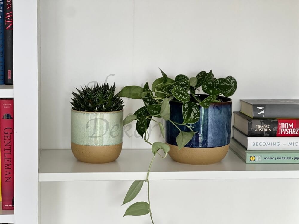 Ceramiczna osłonka doniczkowa łącząca w sobie dwie faktury – na górze szkliwo w kolorze granatowym, a na dole ceramikę wypaloną lecz nie poddaną szkliwieniu. Dwoistość faktur stanowi o atrakcyjności tej osłonki. Liczne celowe niedoskonałości (zacieki, delikatne wżery, popękane szkliwienie-crackle itp.) dodają jej oryginalnej szlachetności i jednocześnie niepowtarzalności. Doniczka ma w sobie urok artystycznego rękodzieła i pasuje do wielu stylów wnętrzarskich.