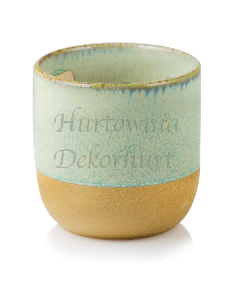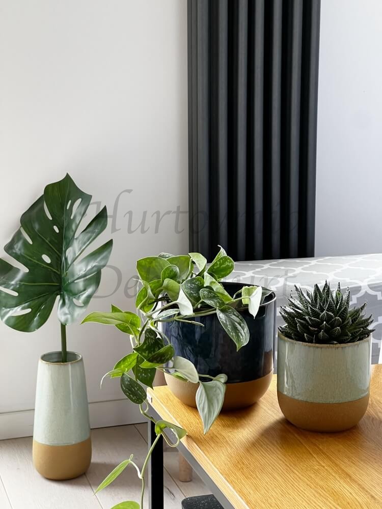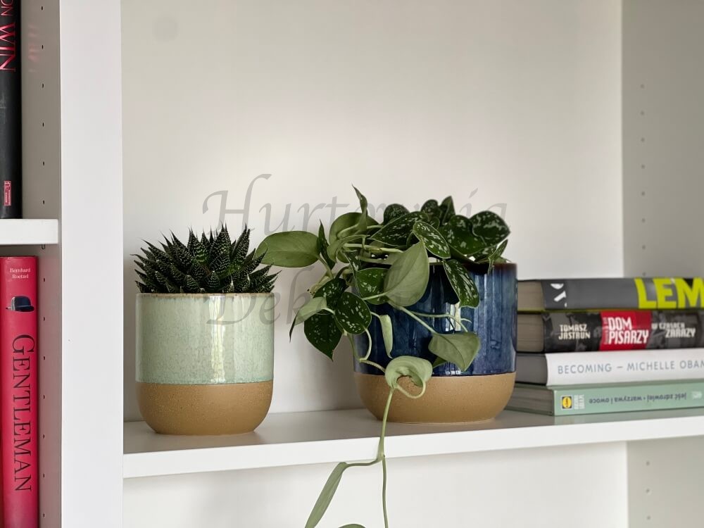 Ceramiczna osłonka doniczkowa łącząca w sobie dwie faktury – na górze szkliwo w kolorze granatowym, a na dole ceramikę wypaloną lecz nie poddaną szkliwieniu. Dwoistość faktur stanowi o atrakcyjności tej osłonki. Liczne celowe niedoskonałości (zacieki, delikatne wżery, popękane szkliwienie-crackle itp.) dodają jej oryginalnej szlachetności i jednocześnie niepowtarzalności. Doniczka ma w sobie urok artystycznego rękodzieła i pasuje do wielu stylów wnętrzarskich.
