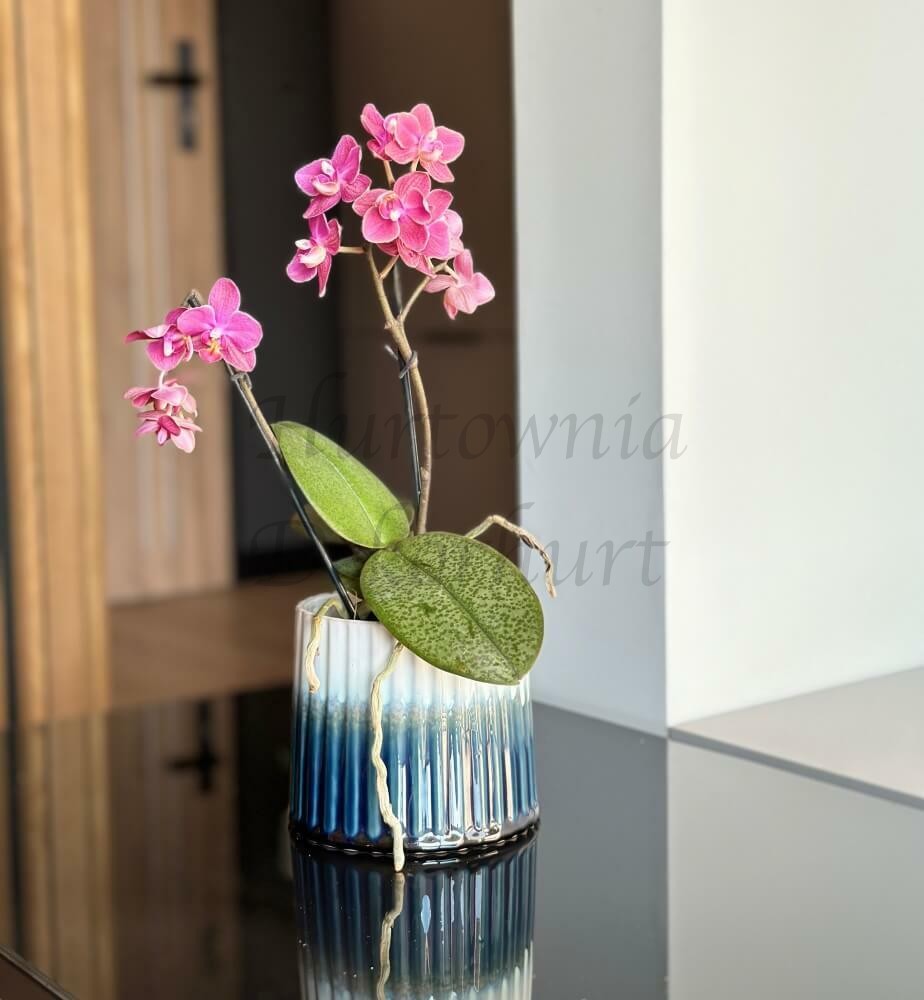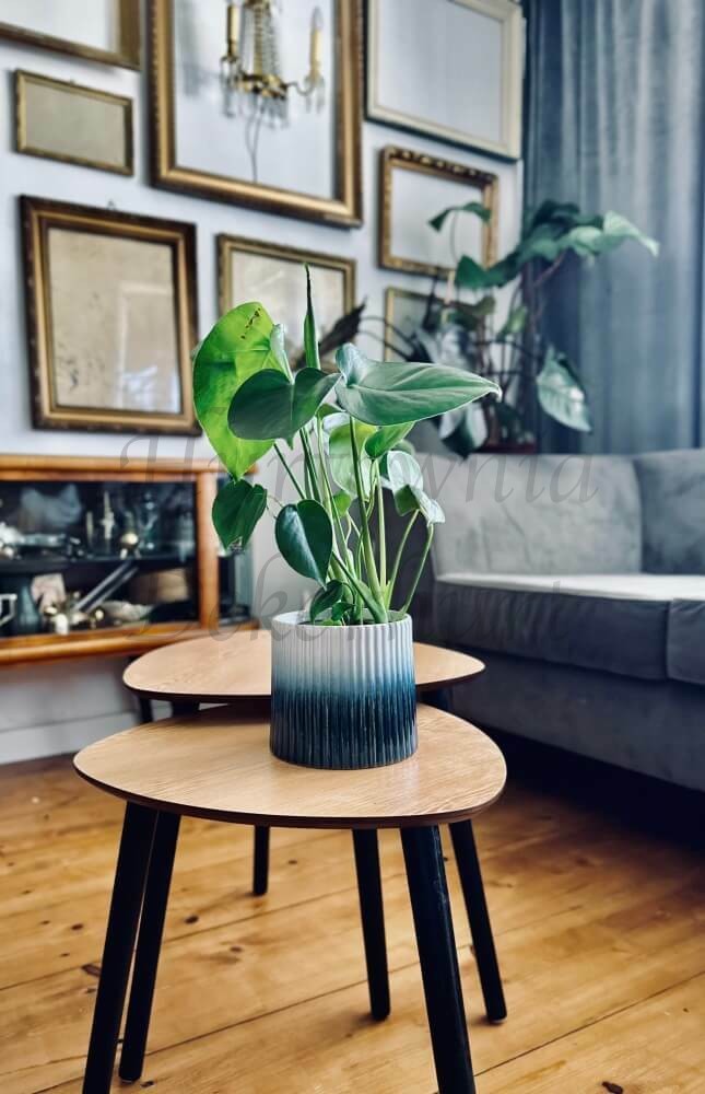 Okrągła donica wykonana z ceramiki szkliwionej łącząca w sobie dwie faktury — na górze szkliwo w kolorze zielonym, a na dole ceramikę wypaloną, lecz nie poddaną szkliwieniu. Dwoistość faktur stanowi o atrakcyjności tej osłonki. Charakterystycznym elementem donicy jest subtelnie wywinięty rant, który nadaje jej lekkości i finezji. To połączenie nowoczesnej elegancji z naturalnym, organicznym wykończeniem sprawia, że donica staje się harmonijnym uzupełnieniem zarówno tradycyjnych, jak i bardziej współczesnych aranżacji wnętrz.