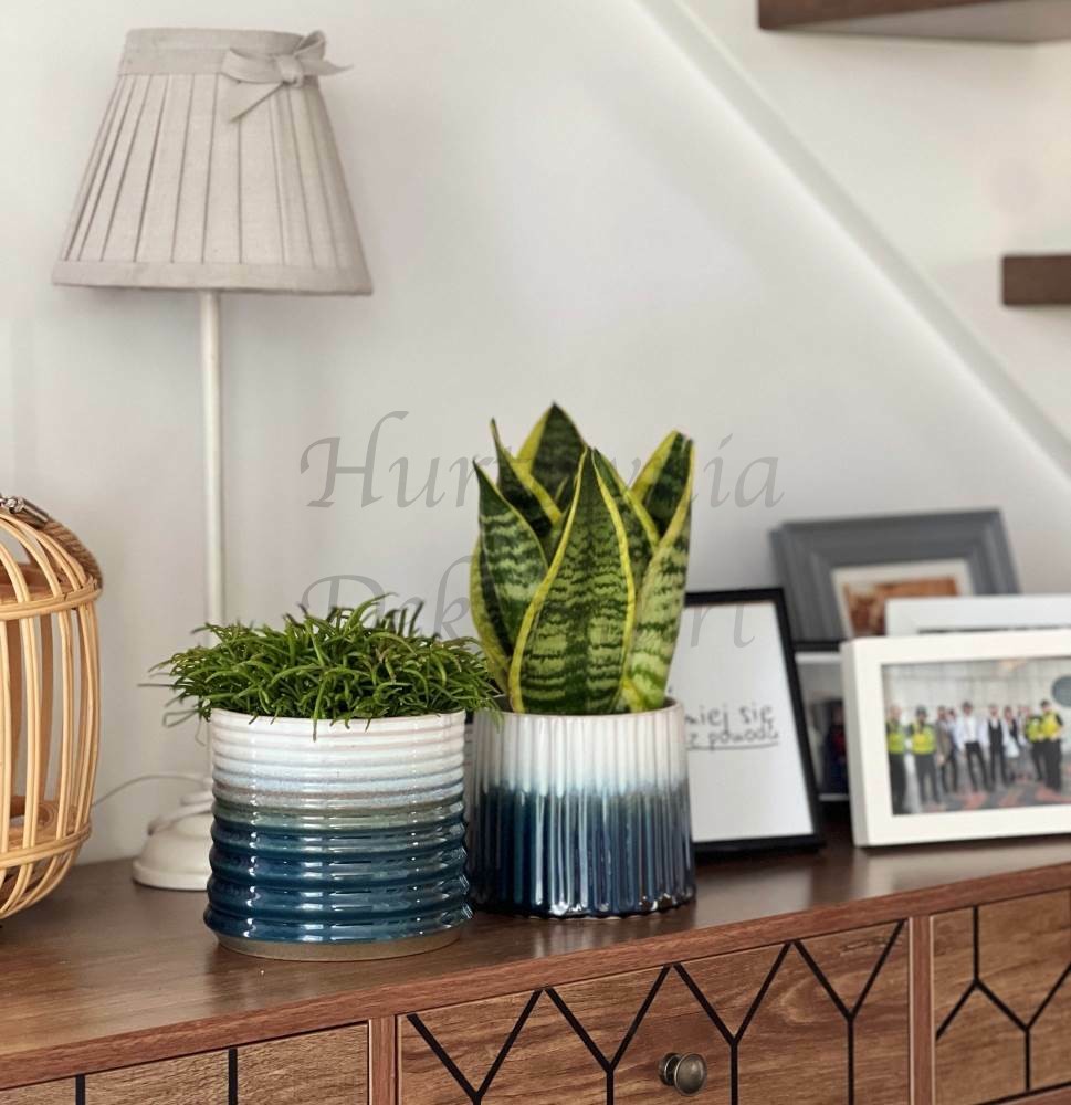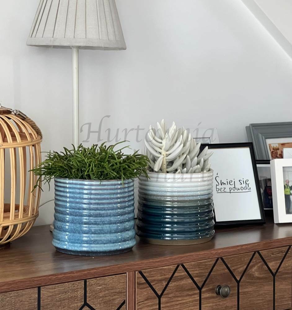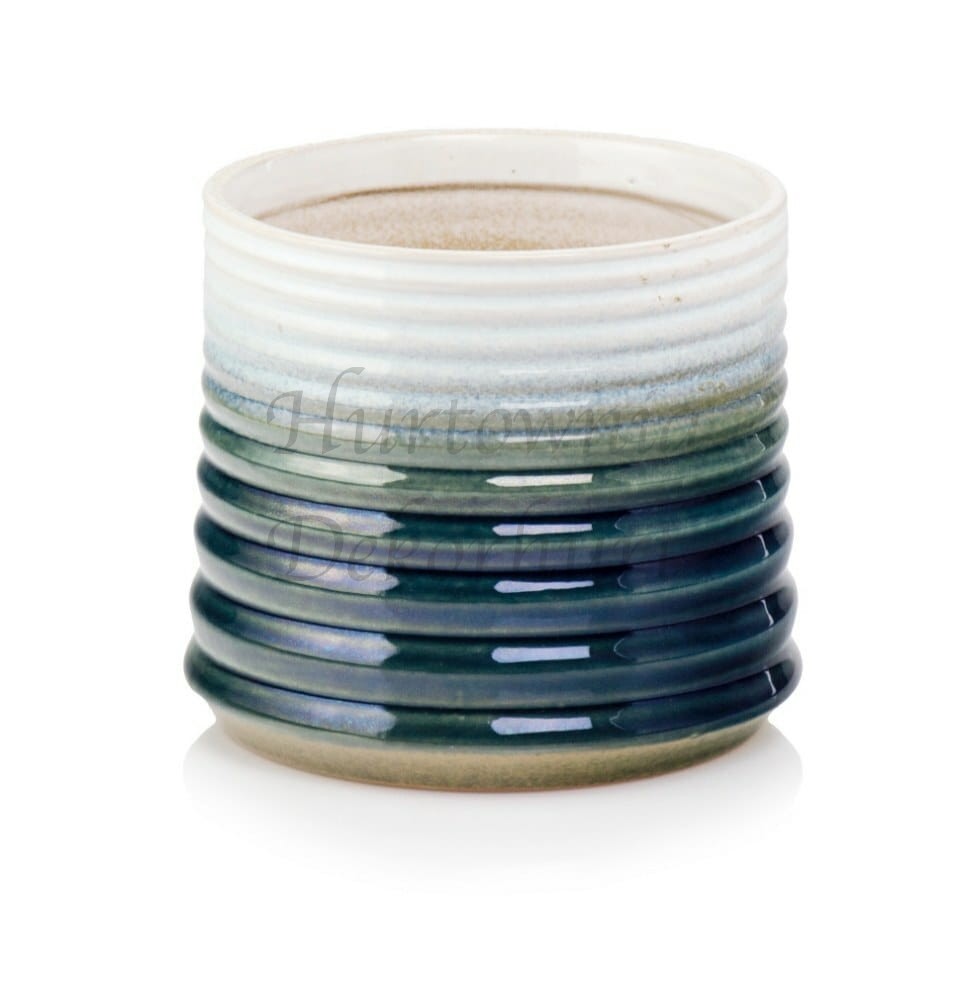 Okrągła donica wykonana z ceramiki szkliwionej łącząca w sobie dwie faktury — na górze szkliwo w kolorze zielonym, a na dole ceramikę wypaloną, lecz nie poddaną szkliwieniu. Dwoistość faktur stanowi o atrakcyjności tej osłonki. Charakterystycznym elementem donicy jest subtelnie wywinięty rant, który nadaje jej lekkości i finezji. To połączenie nowoczesnej elegancji z naturalnym, organicznym wykończeniem sprawia, że donica staje się harmonijnym uzupełnieniem zarówno tradycyjnych, jak i bardziej współczesnych aranżacji wnętrz.