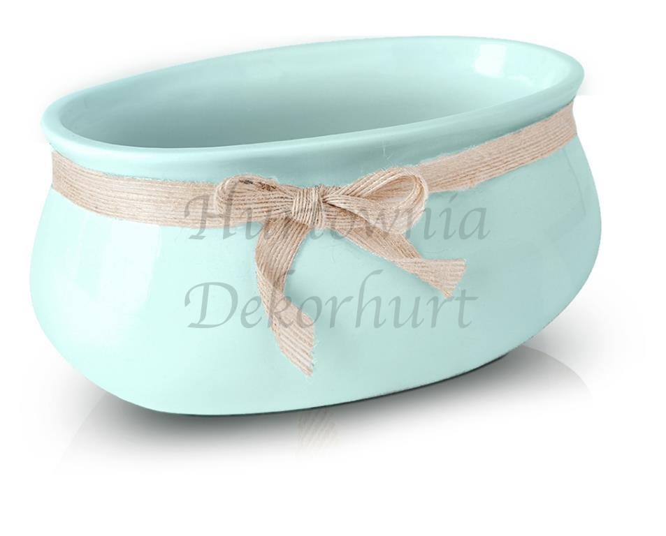 Owalna donica ceramiczna o beczułkowatym kształcie, zdobiona wstążką. Produkt wykonany jest z ceramiki szkliwionej. Więcej informacji znajduje się w zakładce dane techniczne. Produkty wykonane są ręcznie i rzeczywiste wymiary mogą nieznaczenie odbiegać od deklarowanych (+/- 5%).